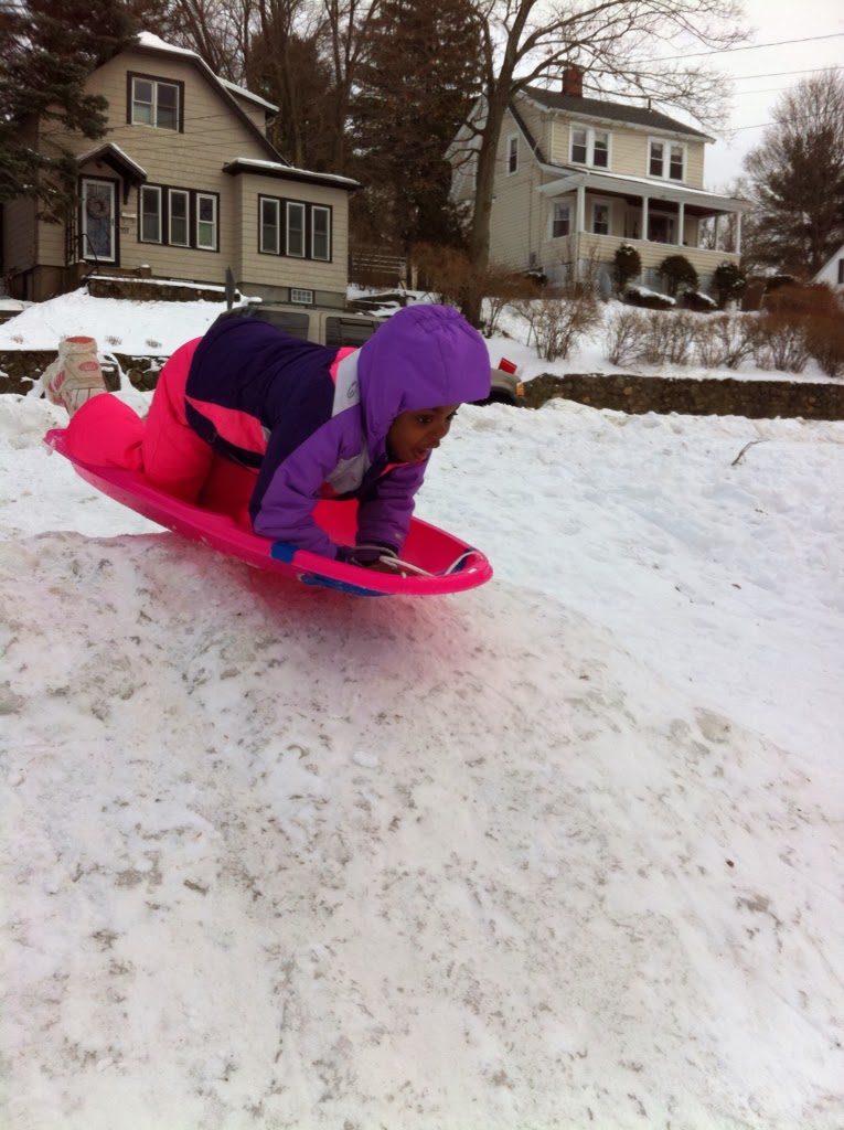 So...yesterday we were on our way to visit our friend Maria after E's gymnastics class when I had to run a quick errand. Right next to where we stopped was a hill with scores of happy children sledding. Of course E, knowing we keep the sled in the trunk of the car, immediately begged to go sledding. I was hesitant because we were not prepared to be playing outside, she did not have any snow pants or mittens, and it was cold out!! But I decided to let her make a few runs, knowing she could change clothes and warm up at Maria's. I gave her my driving gloves to wear and tucked her yoga pants into her boots and called it good. She was so psyched!
